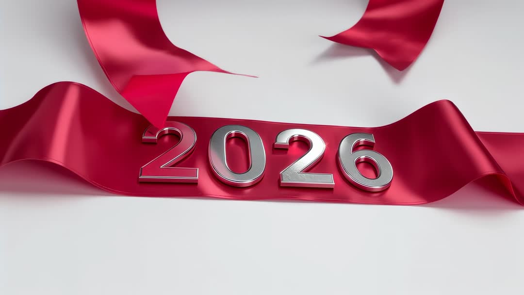 AI Generated Video. Video showing curling red satin ribbon revealing chrome 2026 numerals on clean white background. Smooth camera pan or slow reveal animation highlighting reflective metallic surfaces and soft fabric movement. Working well for New Year countdown intros, holiday promotion videos, corporate greeting animations, event openers, product launch teasers. Allowing easy addition of overlay text, logo reveal, lower thirds. Offering loopable composition and extended slow-motion clip for social media reels, website hero banners, broadcast idents, theatrical title sequences. Color palette emphasizing red and silver for festive luxury mood. Suggesting upbeat orchestral or synth soundtrack and bold sans-serif typography for maximum impact.
