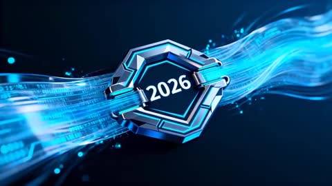 AI Generated Video. Single-frame from video showing rotating chrome hexagon emblem stamped 2026 while streaming neon blue data ribbons flowing across dark digital stage. Design featuring glossy metallic badge, holographic glow, binary code streaks, and floating particle bokeh, creating high-tech futuristic mood. Motion emphasizing sliding numeral reveal and ribbon movement, offering loop-friendly visual for opening sequences, countdowns, and brand idents. Serving for tech launch videos, AI and fintech presentations, blockchain promotions, cybersecurity campaigns, product reveal reels, website hero banners, social media ads, and conference openers. Color palette featuring electric blue, cyan, deep navy, pairing well with modern sans-serif typography and neon UI accents. Deliverables suggestion including 4K motion clip, lower-third overlay, and title card templates for seamless integration into workflows. Licensing suitable for commercial and editorial use.