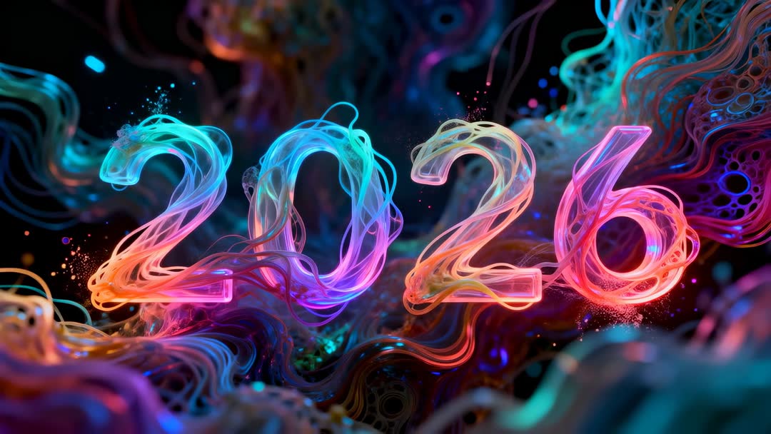 AI Generated Video. Featuring neon filament numerals forming 2026, pulsing, undulating, and emitting colorful particles and light trails against deep black backdrop. Offering loopable cinematic motion suited for New Year promos, event openers, countdown overlays, club visuals, and social media bumpers. Supporting high-resolution output for broadcast, digital signage, website hero banners, and presentation backgrounds. Allowing easy color grading and text overlay for branding, lower-third animation, and title sequences. Working well with VJ software, motion editors, and live visual sets to create energetic, futuristic, and celebratory atmospheres.