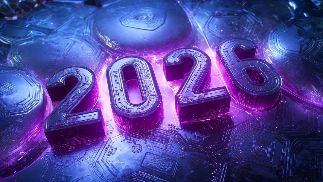 - 2026 Neon Metal Numerals Rising from Futuristic Circuit Board with Magenta Glow