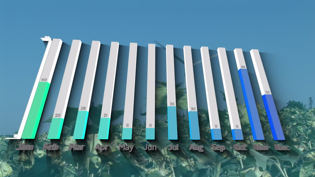 The video features a 3D bar graph with financial or analytical data overlayed on a scenic landscape of wind turbines under a clear blue sky. Each bar is labeled with months and corresponding numerical values, providing a visual analysis of data trends across different months. This visual can be utilized in presentations about renewable energy, financial analytics, environmental studies, or reports on sustainability initiatives to emphasize the convergence of technology and ecology.