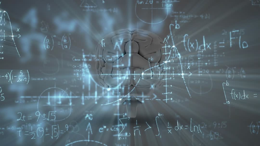 - 3D Brain Model Among Floating Math Formulas Visualizing Scientific Concepts