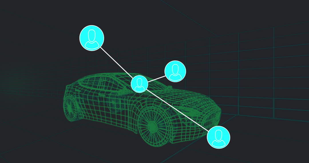 Conceptual visualization showing digital connection between 3D car model and network nodes. Ideal for use in presentations or materials related to automotive technology, digital engineering innovations, and the future of vehicle design. Perfect for highlighting concepts of connectivity and global collaboration within the automotive sector.