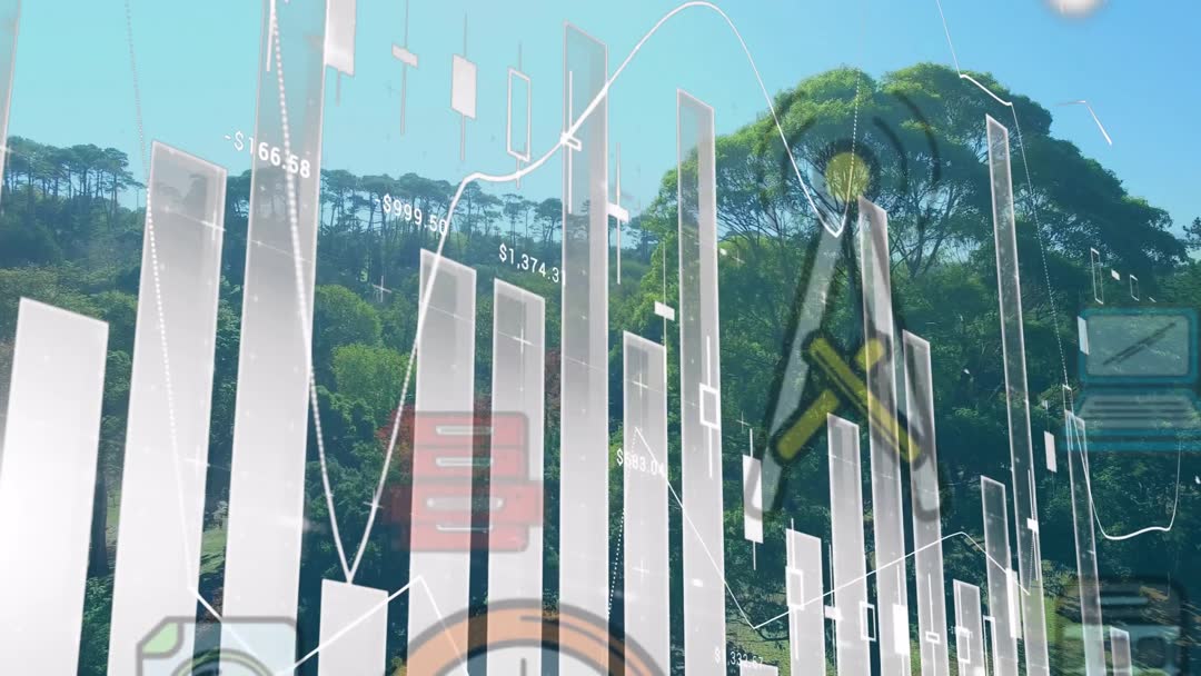 This illustration seamlessly integrates financial data elements with a natural forest setting, symbolizing a harmonious blend of technology, sustainability, and economic growth. Suitable for presentations, reports, or advertising material focused on ecological innovation, green technology markets, or investments in sustainable ventures. Ideal for use by businesses, environmental agencies, financial firms, or technology-driven startups, it emphasizes environmental responsibility combined with technological progression.