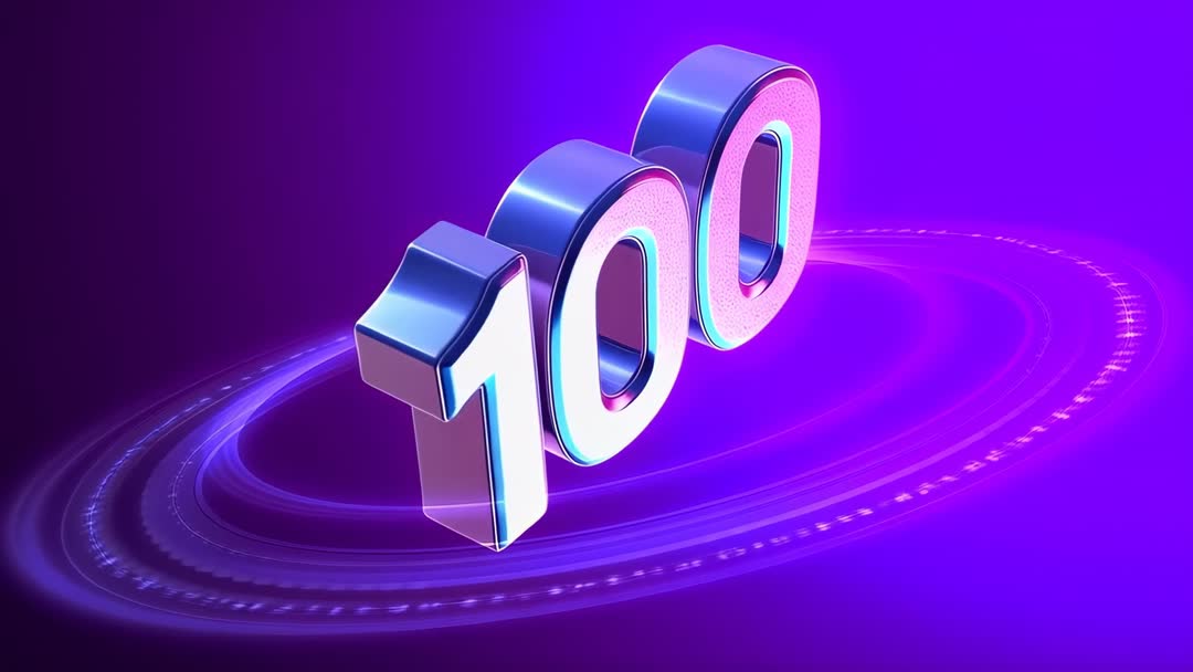 AI Generated Image. High-energy 3D motion graphic showing chrome numeral 100 rotating inside neon orbital ring, surrounded by swirling light trails and reflective metallic surfaces. Design featuring glossy chrome finish, vivid purple-blue gradient lighting, and subtle camera tilt for dynamic perspective. Perfect for milestone reveal, sales promotion, live-stream intro, YouTube opener, anniversary announcement, corporate presentation opener, product launch trailer. Loop-friendly animation suitable for overlays, countdown segments, and full-screen openers. Delivery options suggesting looped MP4 or WebM for web, MOV with alpha channel for compositing, and high-resolution frames for still use. Customizable elements including numeral, ring speed, light trail color, camera angle, and reflection intensity for brand alignment. Offering ideas for use as headline teaser, social media short, newsletter hero, event countdown, ad campaign, or celebratory animation for subscriber or sales milestones.