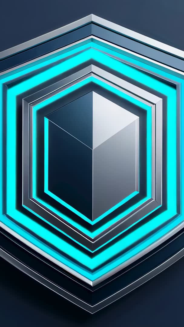 AI Generated Image. Vertical loop animation showing metallic 3D cube rotating inside concentric hexagonal frames while cyan neon glow pulses outward against deep navy backdrop. Clean futuristic aesthetic with reflective surfaces and sharp geometric lines. Ideal for technology promos, app intros, UI backgrounds, cyber security branding, product reveal videos, conference openers, and social media reels. Loop-friendly timing making it suitable for short ads, Instagram Stories, TikTok, and mobile hero sections. Easy color customization for matching brand palette; suggest syncing audio beat to neon pulse for stronger impact. Recommend placing logo on center or lower third with subtle reveal, or using semi-transparent text panel for headlines and calls to action. Deliverable optimized for 9:16 vertical format with high contrast for dark-mode themes.