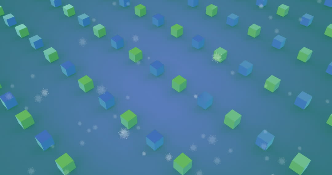 This vibrant animation showcases green and blue 3D cubes spinning in a seamless grid pattern with snowflakes gently falling on a purple digital background. Ideal for use in futuristic technology presentations, website headers, or promotional videos emphasizing innovation and creativity.