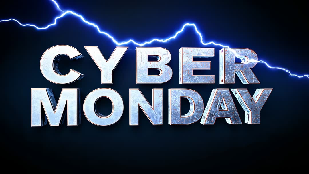 AI Generated Video. Featuring 3D metallic CYBER MONDAY text with cracked reflective surface, dramatic electric blue rim light, and jagged lightning bolt entering left edge. Dark high-contrast background enhancing glow and silhouette, creating cinematic tech-forward look. Providing bold, high-energy visual for holiday online shopping promotions, flash sales, and countdowns. Working well for website hero banners, email headers, social media video ads, paid display creatives, TV promos, and in-store digital signage. Suggesting use of short looped animation with lightning flicker, sub-bass thunder sting, and subtle camera push for added impact. Recommending overlay of custom pricing, discount badges, or CTA buttons in bright contrasting colors for clear messaging. Supplying room for safe area text and logo insertion across bottom center. Delivering striking asset for electronics retail, gaming deals, SaaS promotions, and affiliate marketing campaigns.