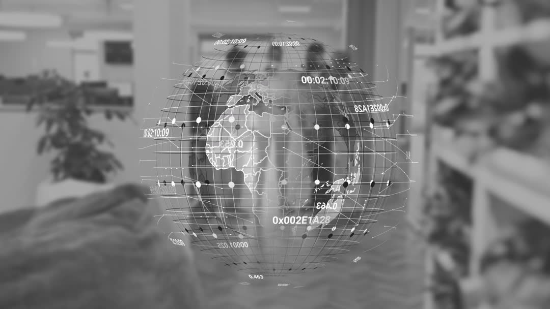 The video presents a digital 3D globe floating over a contemporary office scene. It conveys themes of global connectivity and technological innovation, ideal for content related to global business strategies, international trade, and workplace technology advancements.