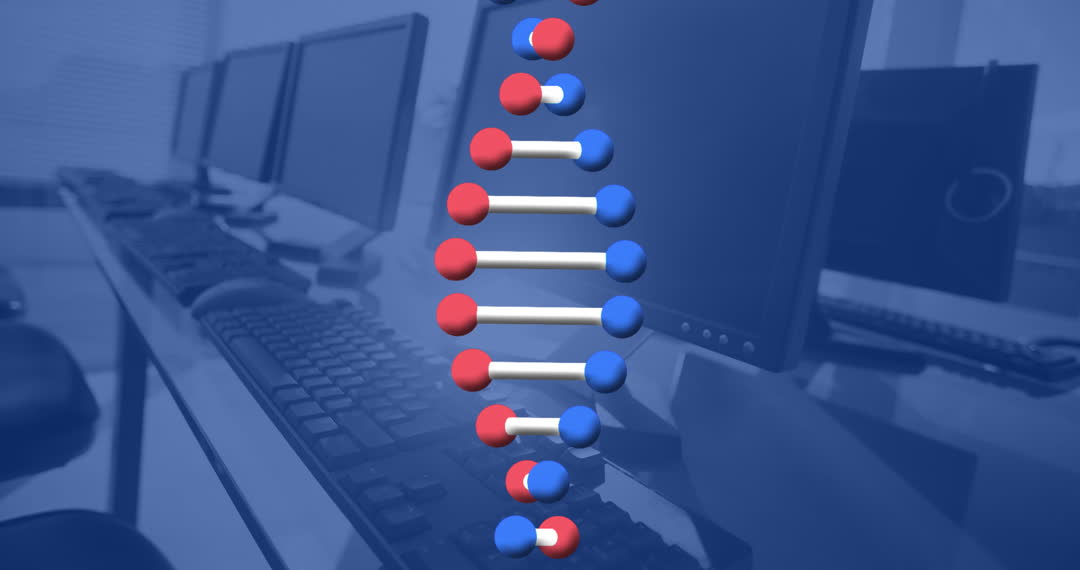 Visual depicts a 3D animation of a DNA double helix model spinning in front of a row of computer workstations, suggesting a link between biotechnology and modern office environments. This digital concept is suitable for illustrating innovative scenes merging science with technology, emphasizing research and development processes in a corporate setting. Appropriate for use in content related to genetic research, business-technological advancements, and healthcare innovation.
