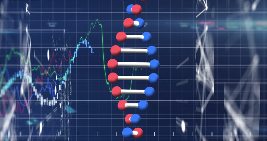 This creative visualization marries molecular biology and finance by overlaying a 3D DNA helix on a backdrop of financial charts. Useful for articles or presentations related to biotechnology investments, the intersect of genetics and finance, healthcare economy, or innovative technologies in scientific data analysis.