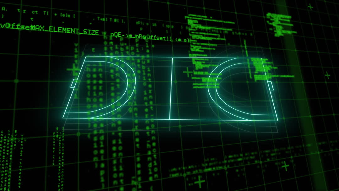 Unique digital illustration of a sports court integrated with a coding background, emphasizing the combination of sports strategy and technology. Useful for tech-centric articles, software showcases, and educational content focusing on STEM, innovation, and sports analytics. Sets a futuristic theme suitable for presentations and marketing for tech and sports events.
