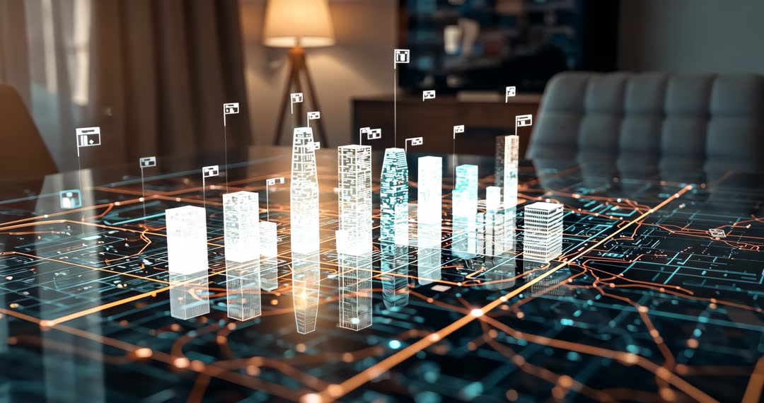 AI Generated Video. This video showcases a futuristic concept where holographic buildings represent an urban area emerging from a digital grid displayed on a coffee table in a modern home. Surrounding flags point out various data metrics related to the building structures. Useful for bringing innovation and tech-driven perspectives into urban planning presentations, architectural firm promotions, or discussions about cutting-edge smart technology integration in everyday household environments.