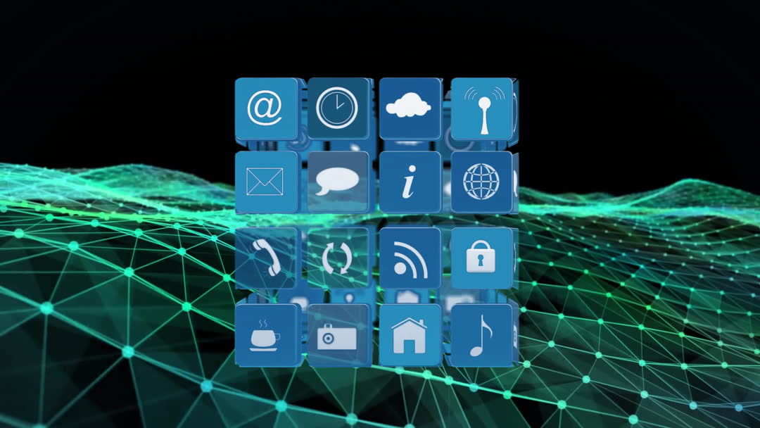 Features animated icons arranged in a 3D cube over dynamic digital waves, symbolizing modern technology and interconnectedness. Useful for illustrating themes of innovation, data exchange, digital communication, and information technology in multimedia projects about tech advancements.