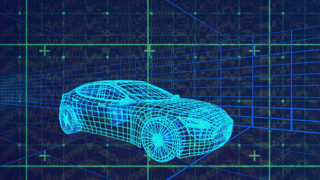 Visualizing a wireframe model of a sports car on a digital grid with a high-tech look perfect for use in automotive design presentations, technology commercials, and engineering software tutorials. This CGI illustration is suitable for conveying concepts of virtual manufacturing, cad design, and futuristic transportation planning.