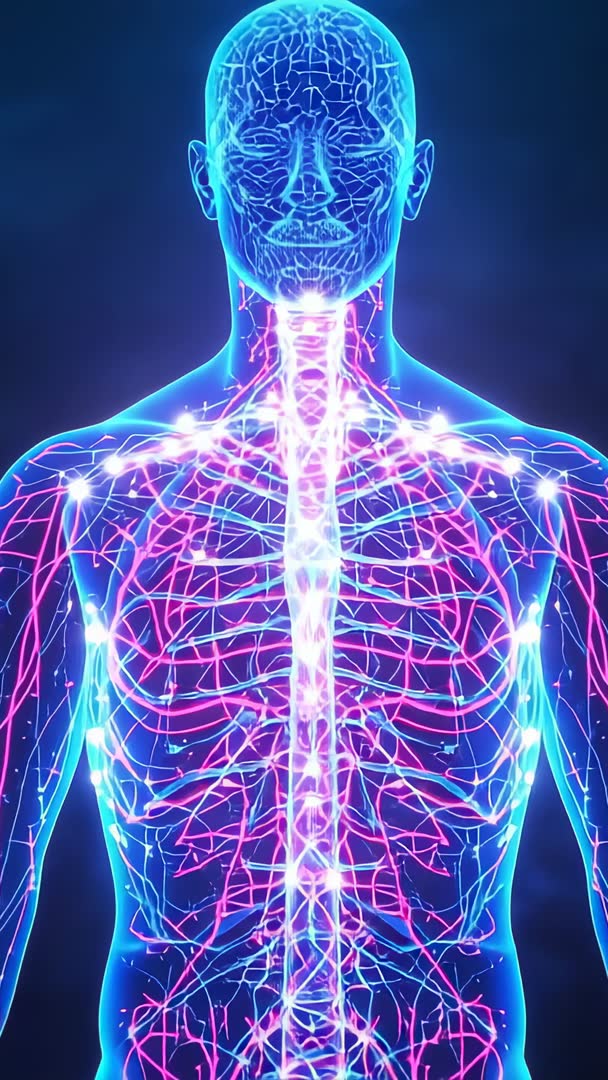 AI Generated Image. Vertical 3D animation displaying translucent human torso with glowing vascular and neural networks. Pulsing light nodes traveling along pink vessels while bright nodes highlighting nerve pathways from neck through chest and upper abdomen. High-contrast neon palette and slow-motion camera revealing network dynamics for medical illustration and tech storytelling. Suitable for medical education videos, surgical planning animations, healthcare marketing reels, biotech product demos, futuristic UI backgrounds, social media vertical ads, conference openers, classroom lectures, patient education clips, journal covers, website hero loops. Usage suggestions: adding infographic labels, voiceover narration, data overlays, animated callouts for physiology explanation; applying color grading and ambient electronic soundtrack for dramatic presentation; cropping and exporting for mobile-first platforms and stories.