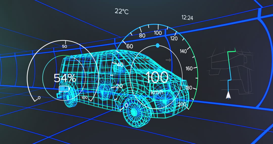 Wireframe graphic combines digital speedometer overlays with a 3D van. Futuristic representation ideal for conveying themes of innovative automotive engineering, technology development, and transport design. Useful in presentations, marketing for smart vehicles, and technology improvement features.