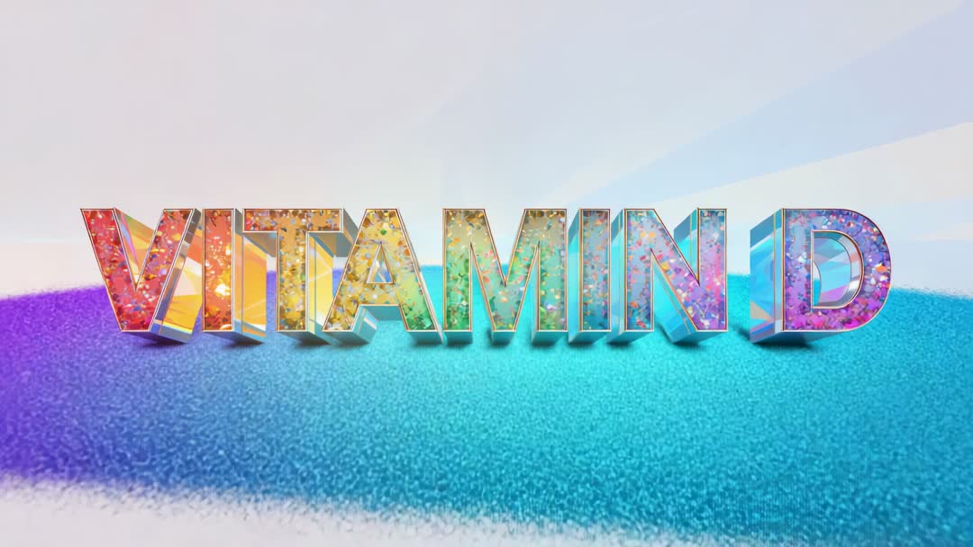 AI Generated Image. Looping motion clip showing 3D VITAMIN D typography filled with iridescent glitter and confetti, resting on sweeping field of blue granules. Camera-level perspective and polished studio lighting creating glossy reflections, vibrant gradients, and subtle shadows. Visual style blending cosmetic shimmer and health product branding with AI-generated texture details. Usage suggestions: use for supplement marketing intros, website hero banners, social media reels and stories, YouTube thumbnails, digital ad campaigns, educational explainer videos about vitamin D, packaging animation, pharmacy or wellness store displays, event title sequences, and background for webinar or presentation openers.