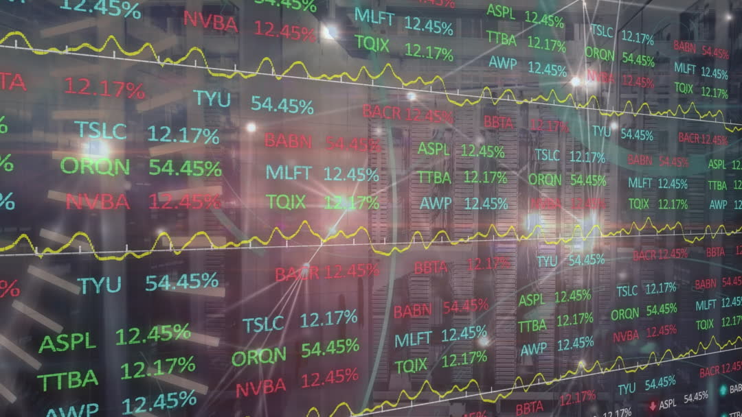 Colorful graphics depict connectivity in modern technology and finance with an indoor setting featuring graphs and light beams. Useful for technology presentations, financial industry insights, future of tech events, or business background visuals depicting connectivity advancements.