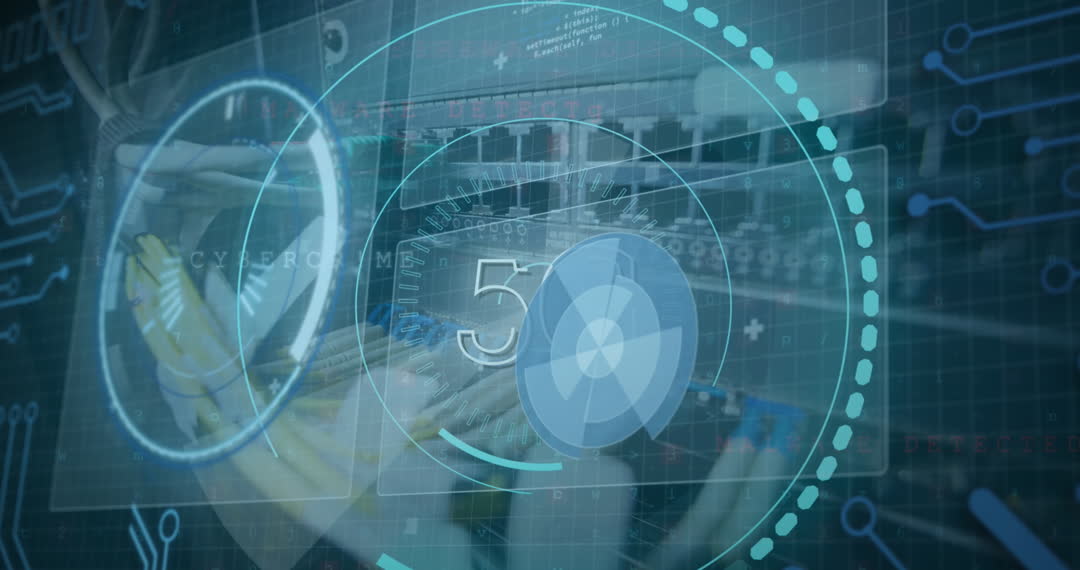 Visualization shows fusion of digital elements with data processing videory focusing on 5G technologies layered over server cables. Ideal for illustrating advancements in telecommunications, high-speed internet connectivity, or digital infrastructure models.