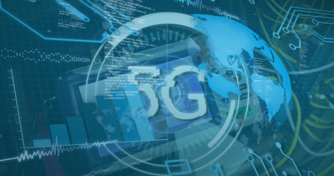 Visual represents merging of 5G technology with global communications, digital coding, and electronic circuits. Perfect for use in tech company presentations, articles about emerging technologies, and materials promoting digital and network innovations.