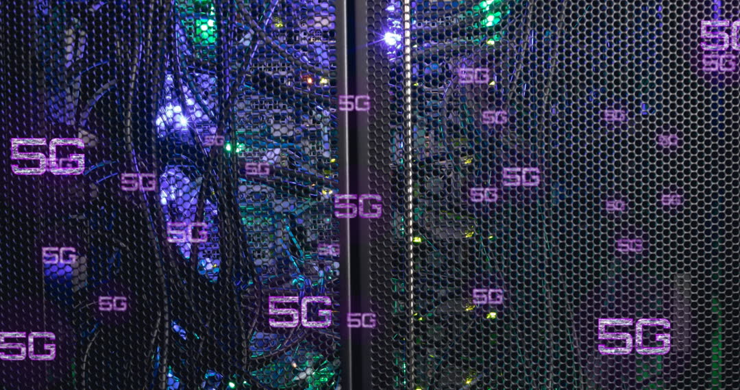 Close-up view of computer servers with virtual '5G' banners overlay. Highlights the intersection of 5G networks and data center technology, showcasing digital infrastructure and telecommunications advancements. Suitable for illustrating articles on global networking, high-speed internet services, or innovations in data storage and infrastructure.