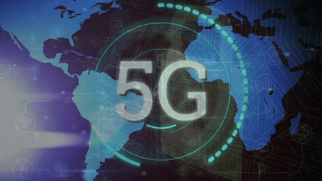 Visual representing advancement of 5G technology and its global impact. Shows concept of digital connectivity with a world map background highlighting areas of technological significance. Ideal for presentations, articles on advanced network technologies, or financial insights into global telecommunications advancements.
