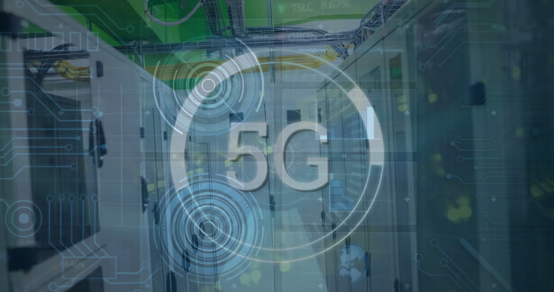 Visualization representing 5G technology overlaying a server room depicts modern network solutions. Useful for illustrating advancements in telecommunications, high-speed data processing, or IT infrastructure in media presentations or marketing materials focused on new technology trends.
