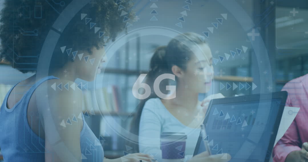 Group of diverse professionals engaging in a business meeting, enhanced by a digital interface overlay of 6G technology. Ideal for illustrating future technological trends, innovation in communication networks, or teamwork in tech-driven environments. Useful for businesses focusing on future-forward strategies and digital collaboration. Could accompany articles or presentations on emerging wireless technologies.