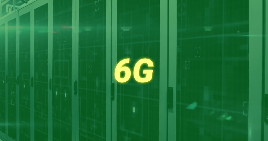This visual showcases 6G technology alongside digital data processing background, highlighted in green tones and computer servers conveying a sense of advanced tech and global connectivity. Ideal for presentations, articles, or designs exploring future telecommunication solutions, advancements in network technology, and high-speed connectivity developments.