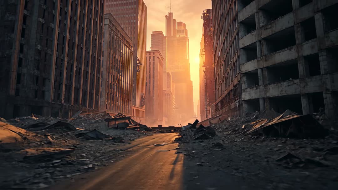 AI Generated Video. This dramatic scene portrays an abandoned urban street overcome by time and neglect. The twilight glow creates an eerie atmosphere, enhancing the feeling of desolation and abandonment. Featuring piled debris and twisted metal remnants, it captures the essence of survival and decay with stunning architectural details. Ideal for use in themes related to dystopian futures, disaster recovery campaigns, or exploring narratives of human resilience. Perfect background for filmmakers and novelists seeking a breathtaking representation of life after civilization's collapse.