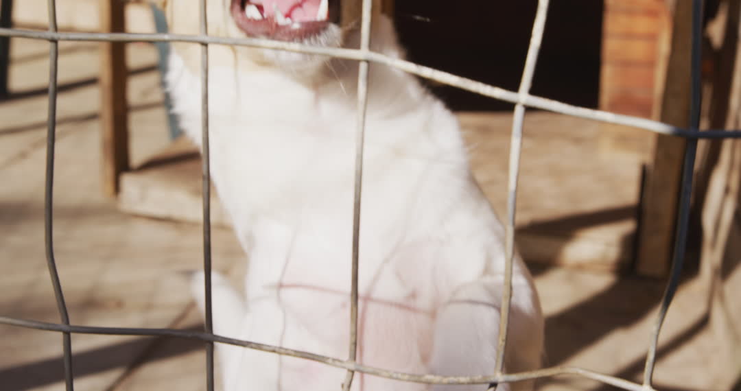 The video shows a white dog standing up against the fence of an animal shelter, barking energetically under the sunlight. Its expressions and wagging tail express a need for attention and a hopeful spirit. The photograph effectively highlights themes related to animal rescue and shelter stories, capturing the innocence and distinct character of an abandoned dog. This heartwarming scene can be used for campaigns promoting animal welfare, shelter donations or for educational content about pet adoption.