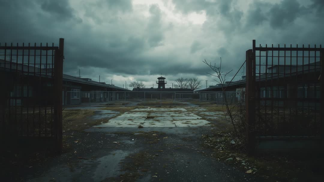 AI Generated Image. Footage showing ajar metal gates framing abandoned prison courtyard with central watchtower under heavy storm clouds. Composition using leading lines from courtyard and puddles drawing eye to watchtower, creating tense, foreboding mood. Lighting presenting cool desaturated tones, low-key shadows, and subtle teal cast. Suiting documentary opener, true-crime feature, thriller trailer, urban exploration piece, historical story about prison closures, social commentary on incarceration, editorial header, or poster art. Editors using footage as establishing shot, atmospheric B-roll, title sequence background, or looping hero banner. Suggested post-production techniques including slow push-in, cross-dissolve transitions, adding film grain and subtle camera shake for gritty realism, grading toward cold blue-green palette, and increasing local contrast to emphasize silhouettes. Mood conveying isolation, neglect, bleakness, and latent tension. Working well for book cover, album art, gallery projection, or website header for projects exploring abandonment, incarceration, security infrastructure, or dystopian narratives.