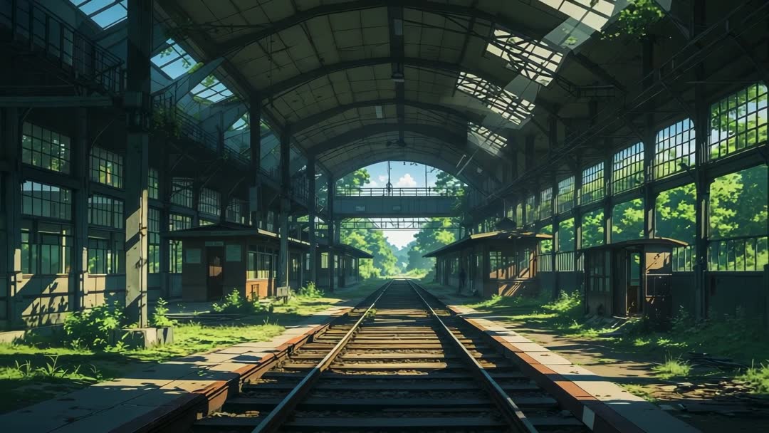 - Abandoned Railway Station with Sunlit Skylight and Overgrown Vines
