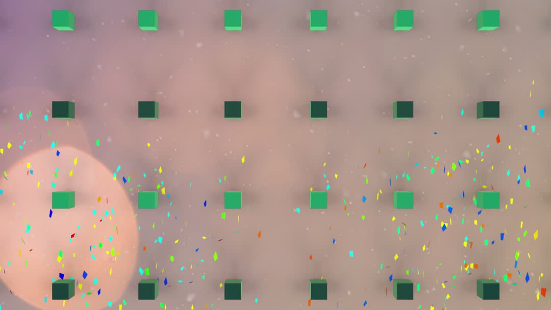 Abstract arrangement of green 3D blocks forms a grid-like pattern set against a gradient background. Below, colorful confetti appears to cascade in motion, adding a festive and lively touch. Ideal for backgrounds in digital presentations, party or celebratory invitations, and marketing materials needing a vibrant and energetic theme.