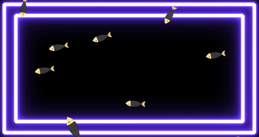 Bright and attractive animation with fish falling against black background, surrounded by a luminous neon frame. Geometric patterns offer abstract art appeal, suitable for contemporary design projects. Useful for video backgrounds, digital presentations, and multimedia art festivals.