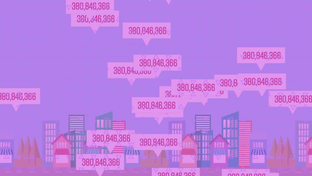 Colorful animation depicting social media icons and notifications floating above a stylized cityscape. Suggests a digital interface interconnected with urban life and technological communication. Useful for illustrating themes of social networking, digital business strategies, and modern urban development. Ideal for use in technology showcases, presentations on media influence, and as a visual metaphor for digital interconnectedness in urban settings.