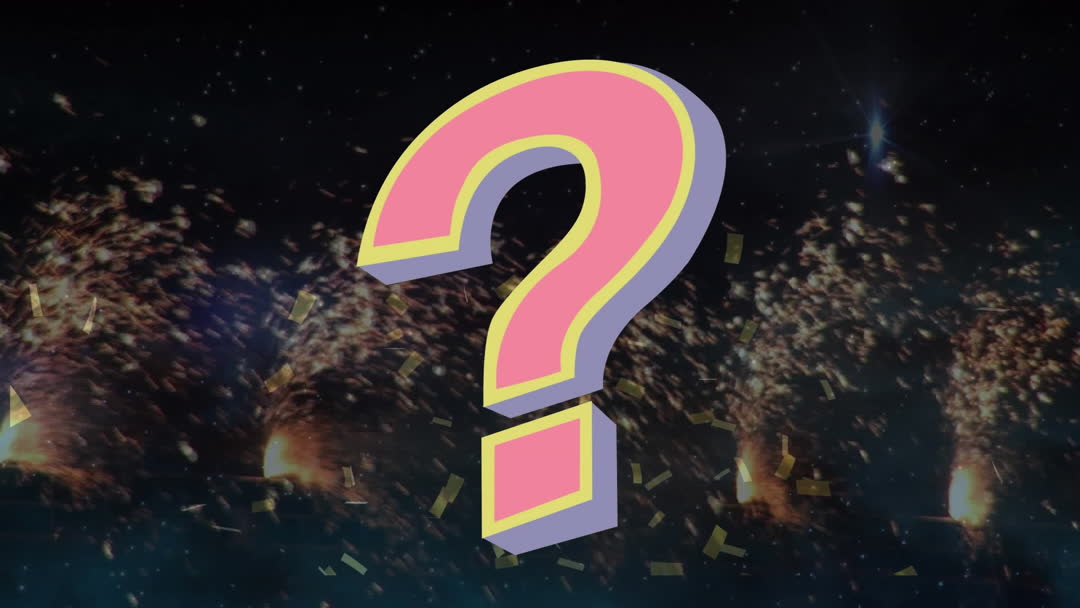 Digital animation featuring a prominent question mark superimposed over a lively background of sparkling fireworks, creating a sense of mystery and intrigue. This vibrant and abstract visual can be useful for marketing projects, presentations involving concepts of doubt or inquiry, event branding, or creative designs requiring an exciting and dynamic effect.