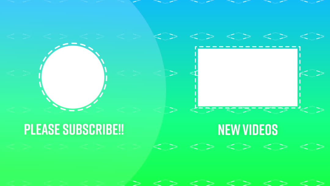 Bright and playful end screen animation for video creators, featuring vibrant blue and green gradients forming a geometric landscape. Designed for encouraging audience interaction with visible call-to-action phrases – 'Please Subscribe' and 'New Videos'. Perfect for use on video platforms like YouTube to engage viewers and promote channel growth.