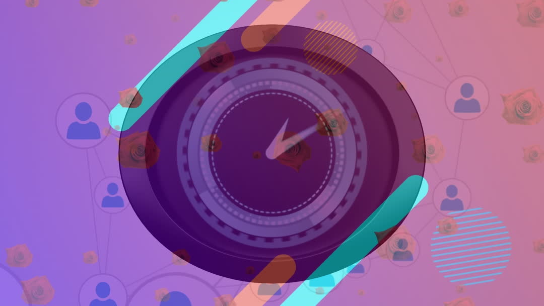 Dynamic and vibrant animation combining abstract shapes, a ticking clock, rose icons, and interconnected profiles. Perfect for illustrating concepts related to time-sensitive global networking, technological connectivity, or visually engaging business contexts. Can be used in presentations, marketing materials, or educational content to highlight sophisticated digital processes.