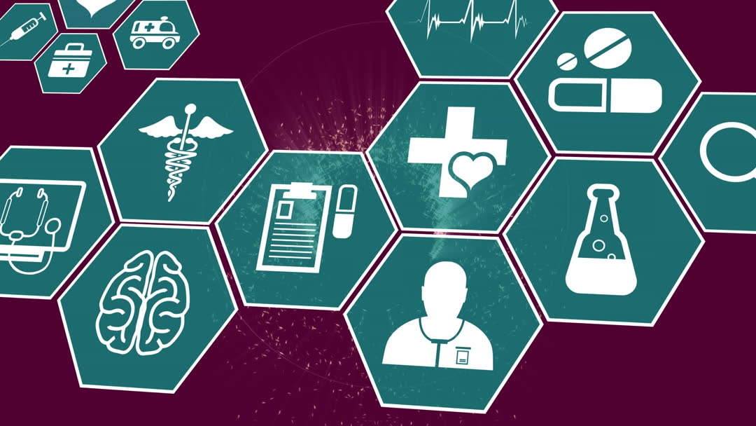 Geometric design showcasing various medical and scientific symbols such as medicine, healthcare, and research icons. Represents developments in health technology and global science initiatives. Useful for medical presentations, scientific research materials, and health technology covers.