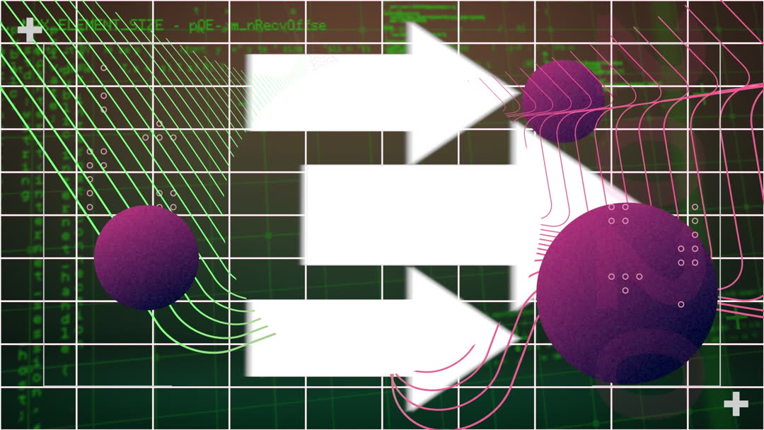 Abstract video featuring white arrows and purple spheres over a digital grid background with green tones suggests idea of flow and transformation in a technological context. Energetic arrangement conveys movement, innovative thinking, suitable for digital and technology content, presentations, and creative design projects.