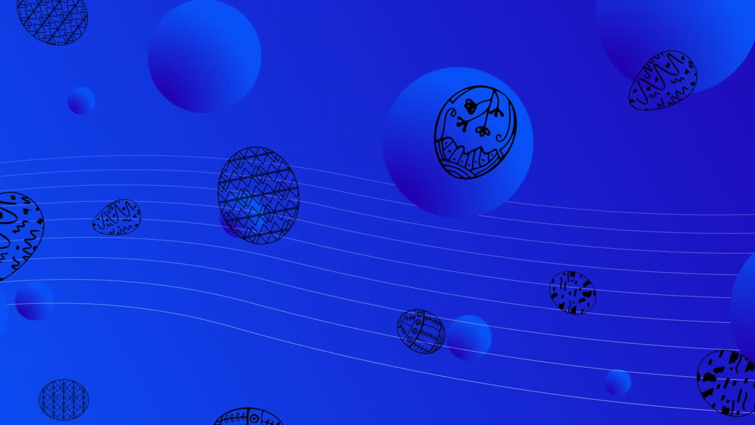 Vibrant abstract design featuring decorative Easter eggs in varying sizes hovering over a textured blue backdrop. Patterns on the eggs add contrast and interest. Ideal for digital illustrations, screensavers, or any creative Easter related graphics. Enhances marketing materials, holiday-themed designs, and festive animations with a modern flair.