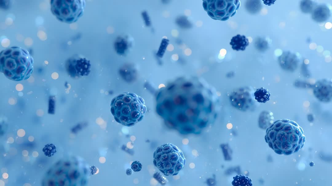 AI Generated Image. Captures vivid blue spheres and rods appearing suspended in a fluid medium, accentuated by sparkling lights. Intended as an abstract representation of nanoparticles in motion. Ideal for contexts involving science, technology, fluid mechanics, or innovative AI demonstrations, meeting the needs of educational, scientific, and media resources.