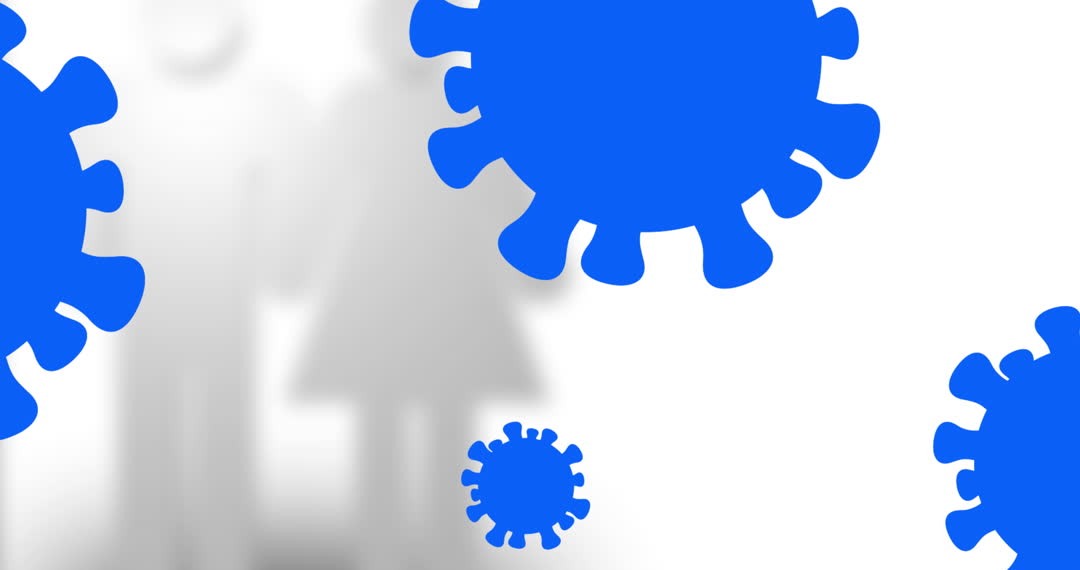 Abstract representation of viral shapes in blue against an illustrative digital background. Blurred human silhouettes in the background suggest anonymity or society's impact. Appropriate for presentations, educational content, or artistic interpretations related to healthcare and pandemics.
