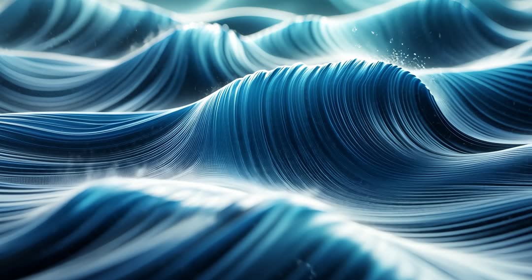 AI Generated Image. Digital art featuring rhythmic blue waves with unique ribbon texture flowing seamlessly, creating a tranquil and serene atmosphere. The subtle motion of foam droplets adds realism and a calming effect, showcasing the harmony between fluidity and texture. Ideal for concepts emphasizing tranquility, movement, and soothing visuals. Suitable for projects focusing on relaxation, backgrounds for digital presentations, and artistic visualization themes.
