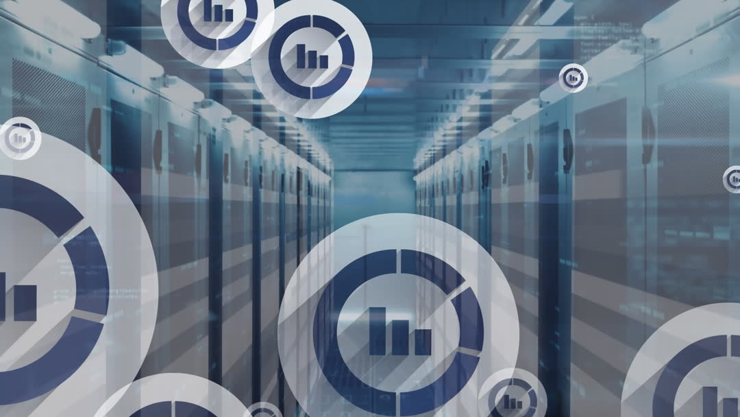 Innovative animation showing graph icons layered over a digital-focused, futuristic server room environment. Suitable for depicting concepts related to business intelligence, technological advancement, data management, and modern network solutions.