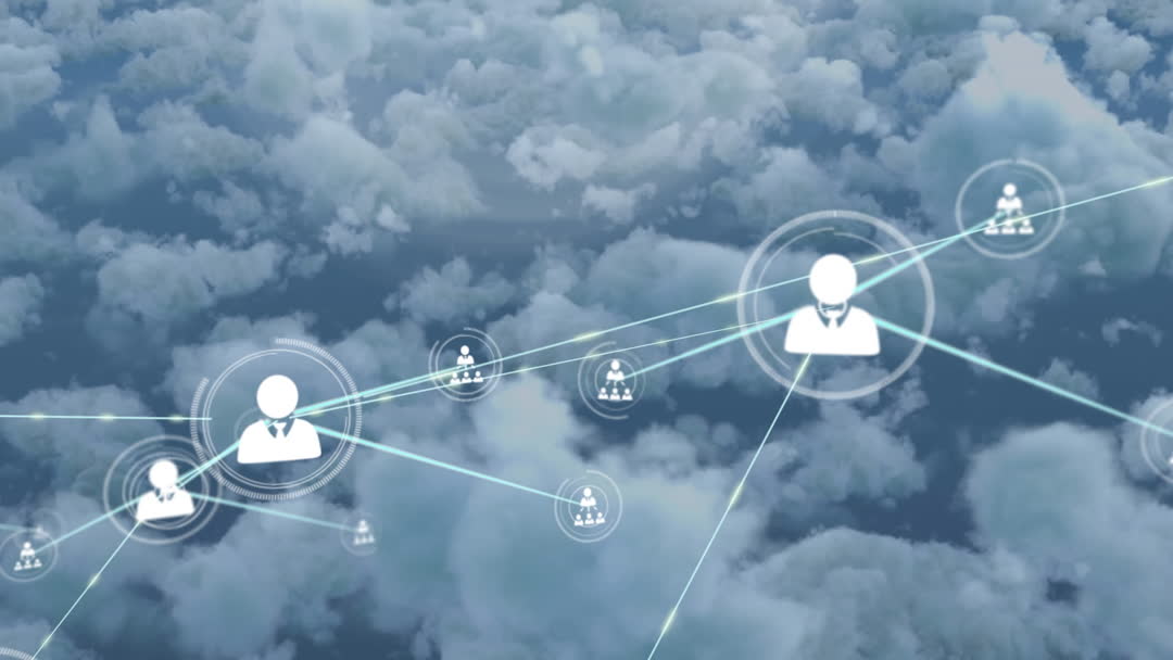 Graphic depicts abstract business connection overlaid on clouds conveying digital networking. Illustrates modern methods of communicating in business environments. Perfect for presentations about connectivity, security, digital transformation, or global business strategies.