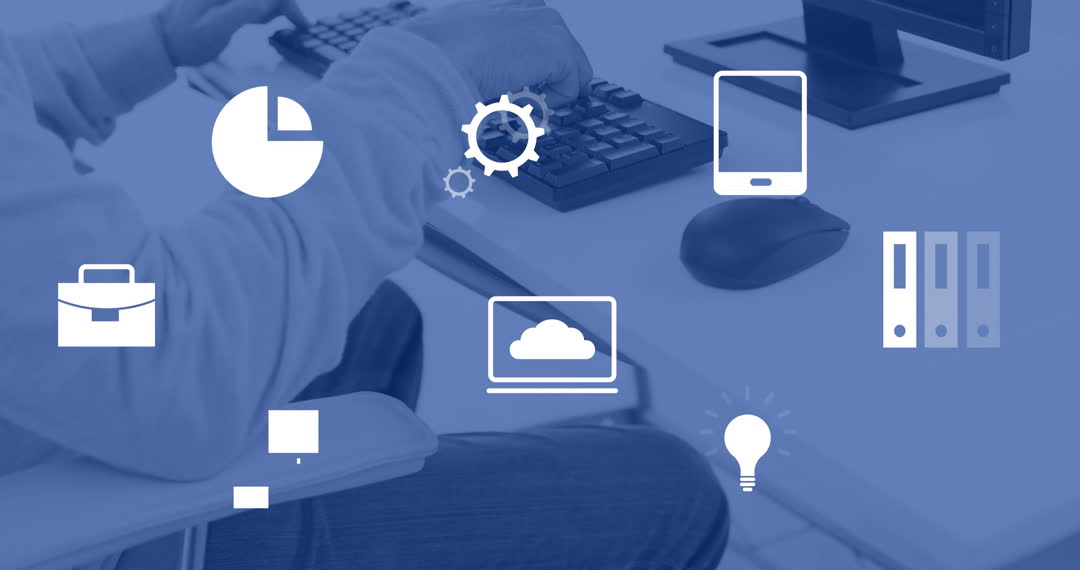 This video features a conceptual representation of business tools and technology with icons like a pie chart, gear, smartphone, briefcase, and more against a blue filter, indicating a high-tech office environment. It is useful for illustrating technology in business or cloud computing processes. Ideal for blogs or presentations focused on modern business techniques and digital workflows.
