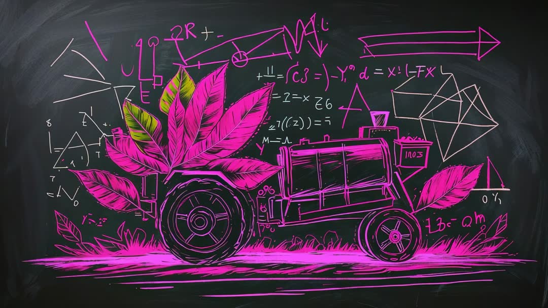 AI Generated Video. Colorful drawing integrating an abstract tractor adorned with vibrant leaves alongside mathematical notations on a school board background. Suitable for educational content, creativity inspiration pieces, or promotional materials highlighting sources of innovative thinking. An ideal visual for documents, web pages, or blog posts discussing sustainability, agriculture technology, or unique artistic techniques backed by artificial intelligence.